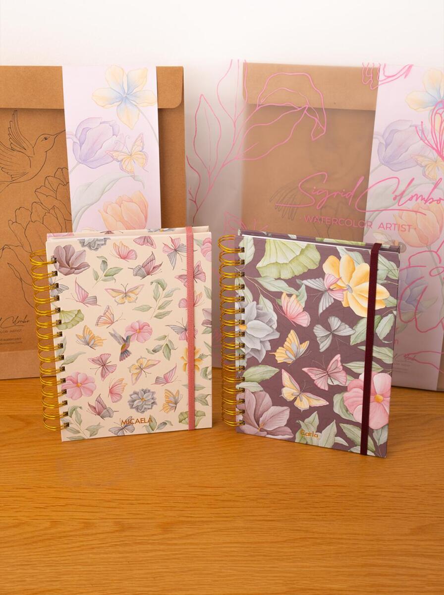 Cuadernos tamaño A5 con doble ring dorado y liga. Con 120 hojas blancas bond rayadas de 90gr.